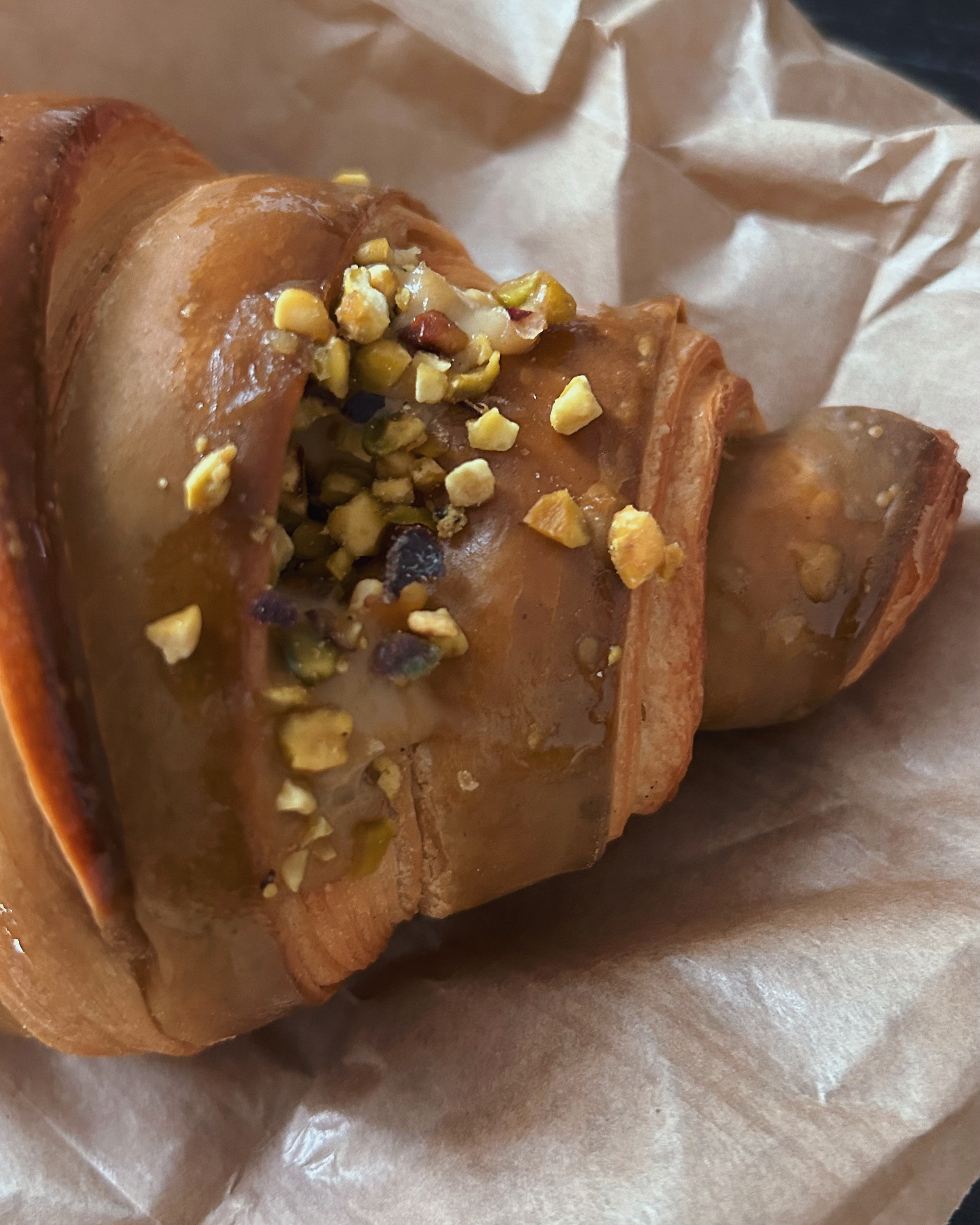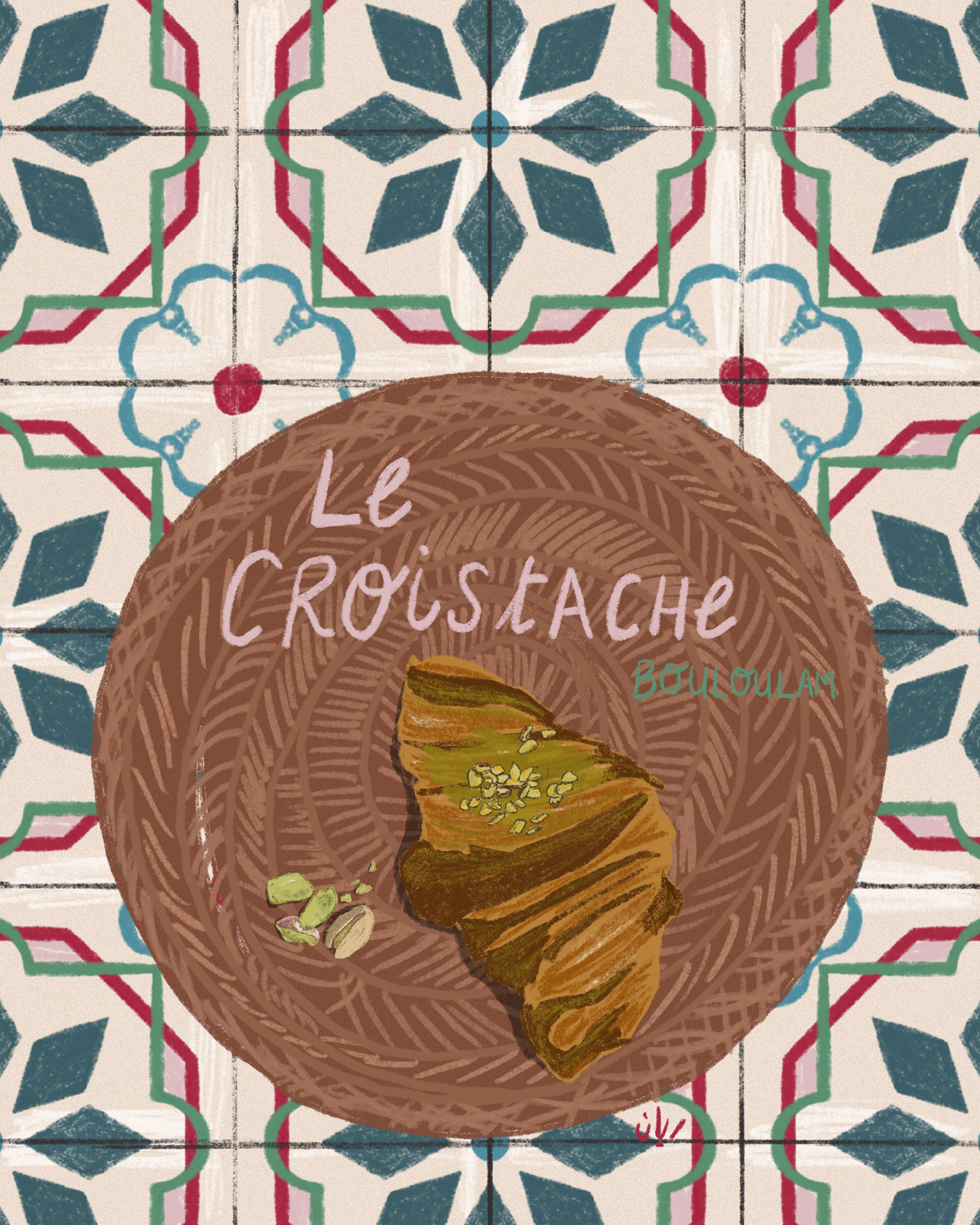 For this editorial project, I created an illustration for a magazine page about the pistachio croissant from Bouloulam, a small bakery in Bordeaux renowned for its creative and delicious pastries and bread. I drew inspiration from the bakery's interior colors and the mosaic floor. I also referenced the rich history of pistachios, which are famous in the Middle East. I decided to design a pattern using these colors and to present the croissant in a basket similar to those used in their shop.